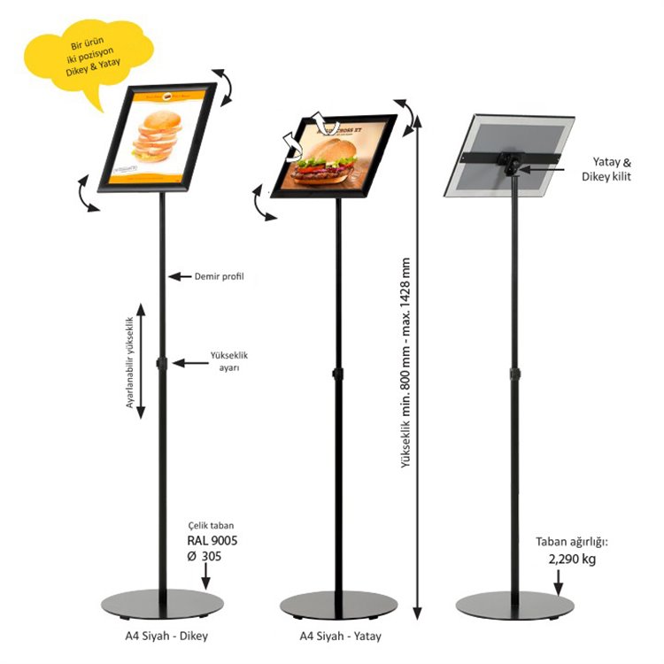 A3 boyutundaki menü veya reklam içeriğinizi düzenli bir şekilde sergileyen bu panolar, müşterilerinizi etkileyici bir şekilde karşılar.